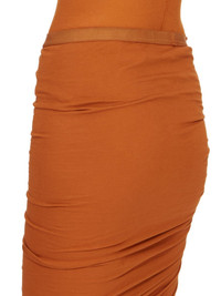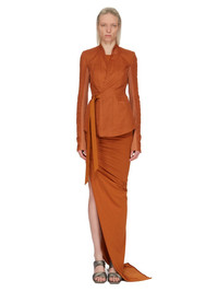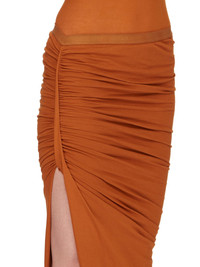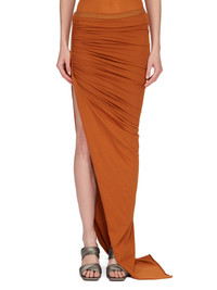 RICK OWENS SS24 LIDO EDFU SKIRT IN CLAY CLASSIC COTTON JERSEY THIS EDFU SKIRT TRAILS FLOOR-LENGTH AND HAS A LONG TRAIN. IT HAS AN ELASTICIZED WAISTBAND AND A TIGHT FIT. IT DRAPES AND WRAPS AROUND THE HIPS, AND GATHERS INTO A RUCHED SEAM ON THE RIGHT THIGH. IT OPENS TO A HIGH SPLIT AND TAPERS TO A NARROW, FLOOR TRAILING, TIP THIS MEDIUMWEIGHT CLASSIC COTTON JERSEY IS COMPACT WITH A DRY HANDFEEL. THIS JERSEY IS MADE USING GOTS CERTIFIED ORGANIC COTTON WHICH MEANS THE NATURAL FIBER IS GROWN WITHOUT HARMFUL CHEMICALS, LEAVING OUR SOIL, AIR AND WATER CLEANER FROM CONTAMINATES WE STRIVE TO KEEP OUR PRODUCTION AS LOCAL AS POSSIBLE. THE FULL MANUFACTURING CYCLE OF THIS PRODUCT, FROM THE MATERIAL KNITTING TO SEWING AND FINISHING, WAS UNDERTAKEN CLOSE TO OUR HOME BASE IN CONCORDIA, ITALY. - COLOR: CLAY - MATERIAL: 100% COTTON - MODEL IS 181CM TALL - MODEL WEARS SIZE 40
