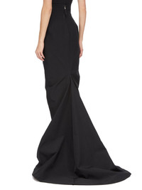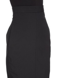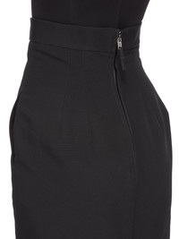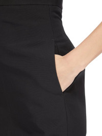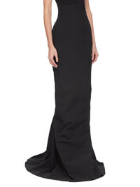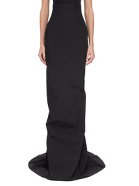 RICK OWENS SS25 HOLLYWOOD RUNWAY LIDO SKIRT IN BLACK POLY COTTON CANVAS THIS LIDO SKIRT TRAILS FLOOR LENGTH, WITH A TIGHT FIT. IT HAS AN EXTRA HIGH WAIST WITH WAISTBAND BACK ZIPPER, SIDE FRONT POCKETS WITH SQUARE CORNERS, AND TAPERED SKIRT THAT FLARES FROM THE KNEE WITH A GODET IN THE CENTRE BACK SEAM THIS MEDIUMWEIGHT COTTON AND POLYESTER CANVAS HAS A VISIBLE CANVAS STRUCTURE AND A DRY HANDFEEL. THE FABRIC HAS MINIMAL FINISHING IN ORDER TO KEEP THE NATURAL CHARACTERISTICS OF THE COTTON YARN THIS FABRIC IS MADE USING GRS CERTIFIED RECYCLED POLYESTER WHICH ENSURES A REDUCTION IN WATER CONSUMPTION, EMISSIONS AND HAZARDOUS WASTE, LESSENING THE DEPENDENCE ON NON-RENEWABLE RESOURCES THIS FABRIC WAS WOVEN ON A 1950’S VINTAGE SHUTTLE LOOM BY BONOTTO, A 4TH GENERATION TEXTILE MILL FOUNDED IN 1912 SITUATED JUST BELOW THE PREALPS IN VENETO, ITALY COLOR: BLACK MATERIAL: 100% COTTON LINING 100% CUPRO MODEL IS 181CM TALL MODEL WEARS SIZE 38