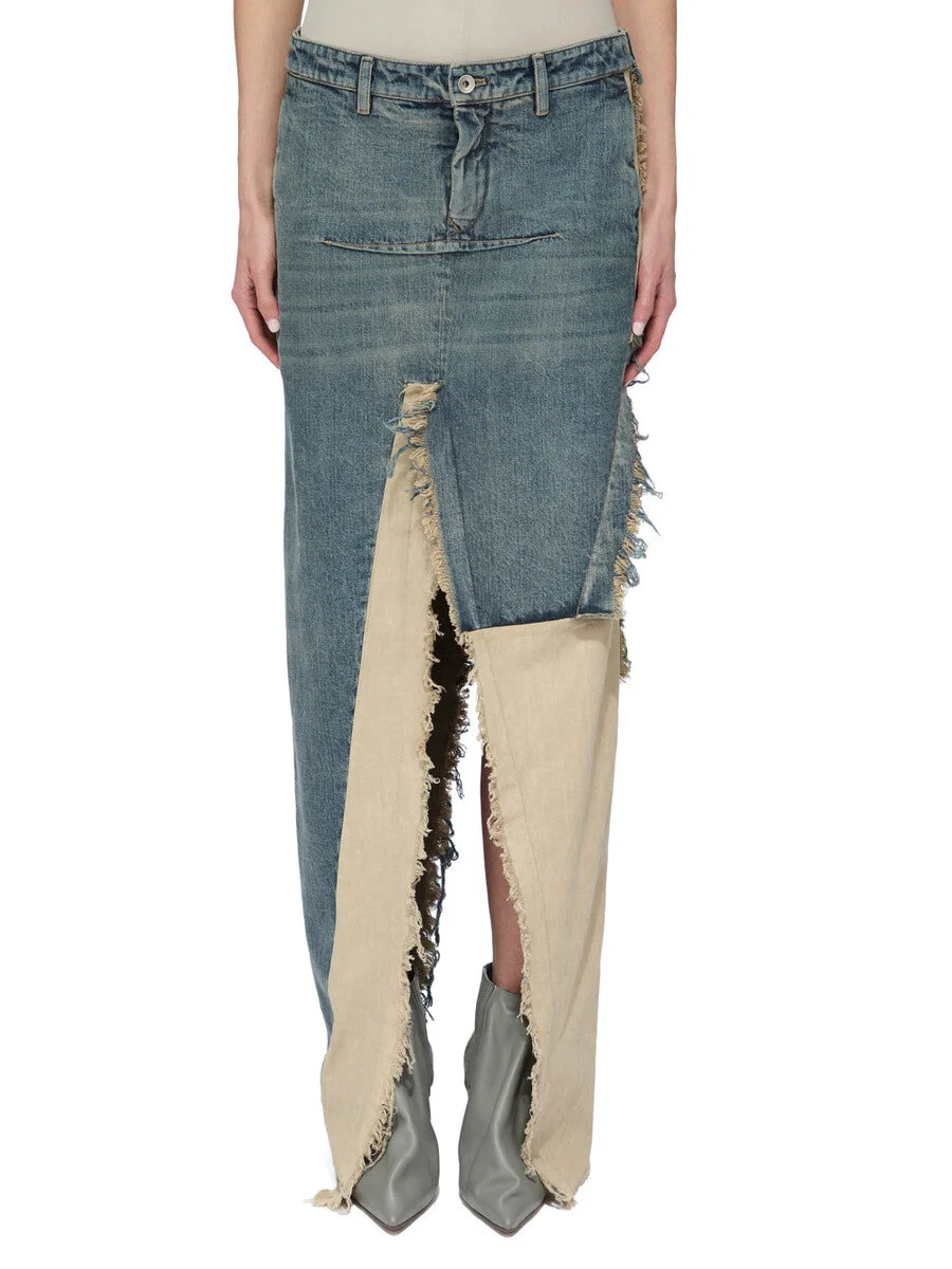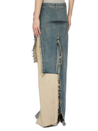 RICK OWENS FW25 CONCORDIANS RUNWAY DENIM SLICED SKIRT IN DIRTY HUSTLER/NATURAL 14OZ HUSTLER SLUB DENIM AND COTTON TELA THIS DENIM SLICED SKIRT IS FLOOR LENGTH AT SIDES. IT HAS A SHORT CENTRE FRONT ZIPPER, AND BUTTON CLOSURE AND A CLOSE TO THE BODY FIT. IT FEATURES TWO HIGH SLITS FRONT AND BACK WITH RAW CUT EDGES, AS WELL AS A FRONT AND BACK RIDGE STITCH DETAIL. IT HAS SIDE SEAM POCKETS. THIS IS A COLLAGE VERSION. THIS IS A COMBINATION OF 14OZ HUSTLER SLUB DENIM AND COTTON TELA. THIS MEDIUMWEIGHT HUSTLER DENIM IS MADE ON A 14OZ JP INDIGO AND NATURAL SLUB DENIM WOVEN IN FUKUYAMA PREFECTURE BY A MILL FOUNDED IN 1893. THE READY GARMENT IS STONE WASHED WITH MINERAL DYES TO ACHIEVE THE HUSTLER WASH. THIS FABRIC IS MADE USING GOTS CERTIFIED ORGANIC COTTON WHICH MEANS THE NATURAL FIBER IS GROWN WITHOUT HARMFUL CHEMICALS, LEAVING OUR SOIL, AIR AND WATER CLEANER FROM CONTAMINATES. THIS GARMENT IS TREATED IN AN ITALIAN WASH HOUSE BASED IN THE VENETO AREA OF ITALY, THAT PRODUCES IN SMALLER TREATMENT BATHS TO REDUCE WATER WASTE AND UTILIZE A WATER PURIFYING PROCESS THAT ENABLES THEM TO RECYCLE A PORTION OF THE WATER USED. ALL OF OUR DENIM WASHES ARE ZDHC CERTIFIED. COLOR: DIRTY HUSTLER/NATURAL MATERIAL: 100% COTTON DETAILS 100% COTTON POCKETS LINING 52% POLYESTER + 48% COTTON MODEL IS 181CM TALL MODEL WEARS SIZE 40