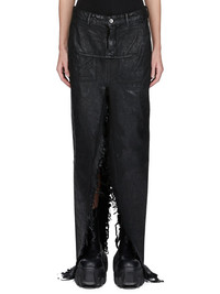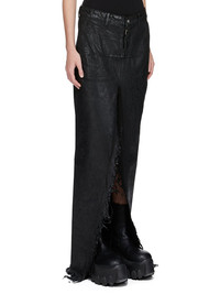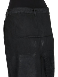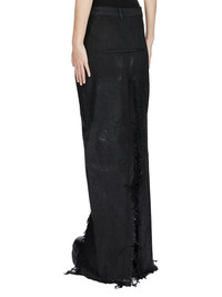 RICK OWENS FW25 CONCORDIANS RUNWAY DENIM SLICED SKIRT IN BLACK 13OZ BLACK MEGACRUST THIS DENIM SLICED SKIRT IS FLOOR LENGTH AT SIDES. IT HAS A SHORT CENTRE FRONT ZIPPER, AND BUTTON CLOSURE AND A CLOSE TO THE BODY FIT. IT FEATURES TWO HIGH SLITS FRONT AND BACK WITH RAW CUT EDGES, AS WELL AS A FRONT AND BACK RIDGE STITCH DETAIL. IT HAS SIDE SEAM POCKETS THIS MEDIUMWEIGHT MEGACRUST DENIM IS MADE ON A 13OZ BLACK AND NATURAL JAPANESE DENIM. THE READY GARMENT IS OVERDYED BLACK AND TREATED WITH A WAX FINISH, THEN SEVERAL LAYERS OF BLACK FOIL IS PRESSED ON TOP AND A FINAL WASH MAKES THE FOIL PEEL AND CRACK THE NATURAL ASPECTS OF THIS TREATMENT MEANS THE FOIL HAS PEELED OFF AND CRACKED IN CERTAIN AREAS AND WILL CONTINUE TO DO SO WITH WEAR AND ABRASION. THIS IS AN INHERENT CHARACTERISTIC OF THIS TYPE OF TREATMENT AND IS A DESIRED A VISUAL ASPECT WHICH ADDS TO THE UNIQUENESS OF EACH PIECE THIS GARMENT IS TREATED IN AN ITALIAN WASH HOUSE BASED IN THE VENETO AREA OF ITALY, THAT PRODUCES IN SMALLER TREATMENT BATHS TO REDUCE WATER WASTE AND UTILIZE A WATER PURIFYING PROCESS THAT ENABLES THEM TO RECYCLE A PORTION OF THE WATER USED. ALL OF OUR DENIM WASHES ARE ZDHC CERTIFIED COLOR: BLACK MATERIAL: 100% COTTON POCKETS LINING 52% POLYESTER + 48% COTTON MODEL IS 181CM TALL MODEL WEARS SIZE 40