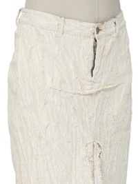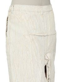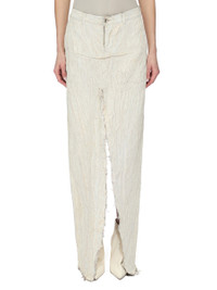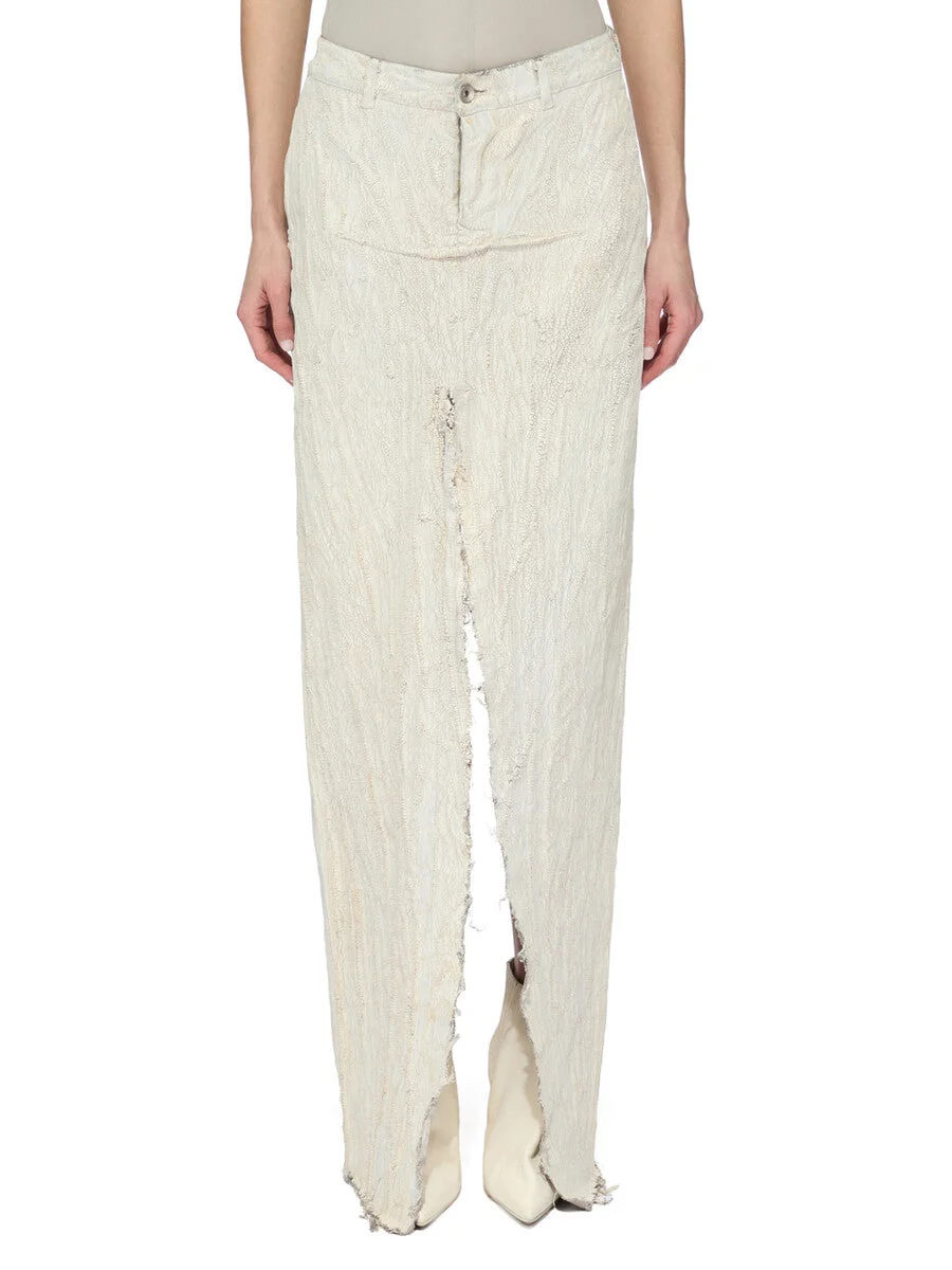 RICK OWENS FW25 CONCORDIANS RUNWAY DENIM SLICED SKIRT IN MILK 13OZ MILK MEGACRUST DENIM THIS DENIM SLICED SKIRT IS FLOOR LENGTH AT SIDES. IT HAS A SHORT CENTRE FRONT ZIPPER, AND BUTTON CLOSURE AND A CLOSE TO THE BODY FIT. IT FEATURES TWO HIGH SLITS FRONT AND BACK WITH RAW CUT EDGES, AS WELL AS A FRONT AND BACK RIDGE STITCH DETAIL. IT HAS SIDE SEAM POCKETS. THIS MEDIUMWEIGHT MILK MEGACRUST DENIM IS OVERDYED DUST AND THEN TREATED WITH LAYERS OF MILK COLORED FOIL THAT IS PRESSED ON BY HAND. THE NATURAL ASPECTS OF THIS TREATMENT MEANS THE FOIL APPLICATION IS IRREGULAR AND HAS PEELED OFF AND CRACKED IN CERTAIN AREAS AND WILL CONTINUE TO DO SO WITH WEAR AND ABRASION. THIS IS AN INHERENT CHARACTERISTIC OF THIS TYPE OF TREATMENT AND IS A DESIRED VISUAL ASPECT WHICH ADDS TO THE UNIQUENESS OF EACH PIECE. THIS FABRIC IS MADE USING GOTS CERTIFIED ORGANIC COTTON WHICH MEANS THE NATURAL FIBER IS GROWN WITHOUT HARMFUL CHEMICALS, LEAVING OUR SOIL, AIR AND WATER CLEANER FROM CONTAMINATES. THIS GARMENT IS TREATED IN AN ITALIAN WASH HOUSE BASED IN THE VENETO AREA OF ITALY, THAT PRODUCES IN SMALLER TREATMENT BATHS TO REDUCE WATER WASTE AND A WATER PURIFYING PROCESS THAT ENABLES THEM TO RECYCLE A PORTION OF THE WATER USED. ALL OF OUR DENIM WASHES ARE ZDHC CERTIFIED. COLOR: MILK MATERIAL: 100% COTTON POCKETS LINING 52% POLYESTER + 48% COTTON MODEL IS 181CM TALL MODEL WEARS SIZE 40