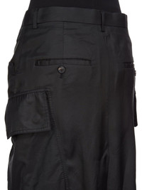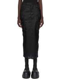 RICK OWENS FW25 CONCORDIANS DRACCA SKIRT IN BLACK CUPRO TWILL THIS FIRBANKS SKIRT IS MID-CALF LENGTH WITH TOP FRONT MASTODON POCKETS, AND TWO LARGE LOWER THIGH CARGO POCKETS WITH FLAPS. IT FEATURES A WAISTBAND WITH CONCEALED FRONT ZIPPER AND BELT LOOPS, SIDE POCKETS AND BACK POCKETS WITH BUTTONS. THIS VERSION HAS A RAW CUT HEM THIS LIGHTWEIGHT AND FLUID CUPRO TWILL HAS A GLOSSY SURFACE AND A SOFT, WASHED HANDFEEL THIS FABRIC IS MADE USING CUPRO WHICH IS BIODEGRADABLE AND 100% PLANT BASED. AS IT’S MADE FROM COTTON WASTE, CUPRO HELPS FIND A PURPOSE TO FIBERS THAT WOULD OTHERWISE BE DISCARDED COLOR: BLACK MATERIAL: 100% CUPRO BUTTONS 100% BUFFALO HORN MODEL IS 181CM TALL MODEL WEARS SIZE 40