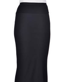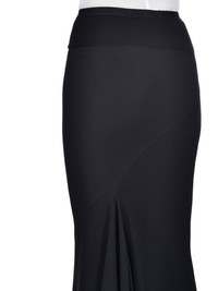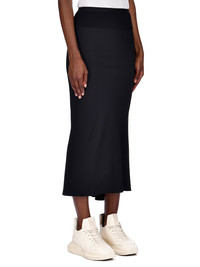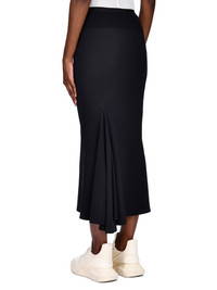 RICK OWENS FW22 STROBE CALF BIAS SKIRT IN BLACK HEAVY CADY THIS CALF BIAS SKIRT IS LOW-CALF LENGTH WITH A WIDE RIBBING AND ELASTICIZED WAISTBAND. IT FLARES SLIGHT FROM THE KNEE FEATURES A DIAGONAL BIAS CUT SEAM WITH DRAPED INSERT AT LEFT BACK THIS IS A HEAVY CREPE MATERIAL WITH A CRISP SURFACE TEXTURE AND A COOL SLICK BACK SIDE. IT IS WOVEN FROM FSC® CERTIFIED VISCOSE AND ACETATE WHICH ENSURES THAT THE FIBERS ARE PRODUCED FROM RESPONSIBLY MANAGED PLANTATIONS AND NO DEFORESTATION OCCURS - COLOR: BLACK - MATERIAL: 53% VISCOSE + 47% ACETATE - BAND 70% COTTON + 30% NYLON - MODEL IS WEARING SIZE 40- MODEL IS 181 CM TALL
