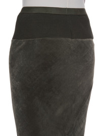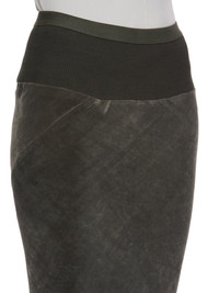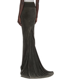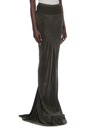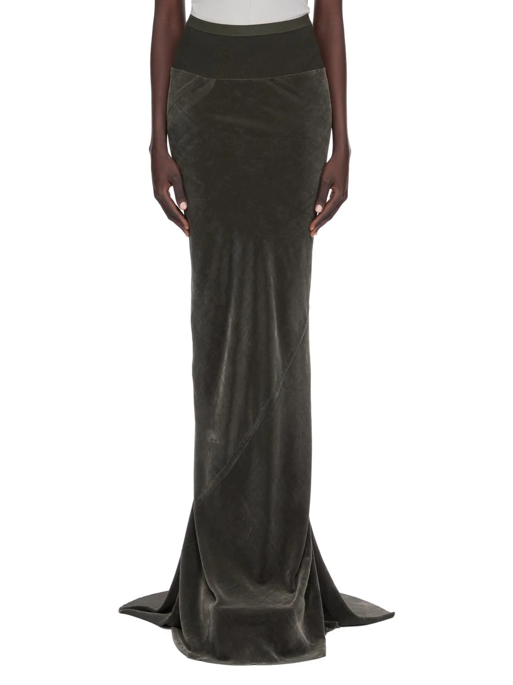 RICK OWENS FW25 CONCORDIANS SLIM LONG CODA IN BOSCO VELVET THIS SLIM LONG CODA SKIRT IS FLOOR LENGTH WITH A WIDE RIBBING AND ELASTICIZED WAISTBAND. IT FALLS IN A SLIM COLUMN TO THE FLOOR AND FEATURES A DIAGONAL BIAS CUT SEAM WITH DRAPED INSERT AT MID BACK THIS LIGHTWEIGHT AND FLUID VELVET HAS A SOFT AND WASHED UNEVEN FINISH. THIS FABRIC IS MADE FROM CERTIFIED VISCOSE WHICH ENSURES THAT THE FIBERS ARE PRODUCED FROM RESPONSIBLY MANAGED SOURCES AND NO DEFORESTATION OCCURS COLOR: BOSCO MATERIAL: 82% VISCOSE + 18% SILK BAND 65% COTTON + 35% NYLON MODEL IS 181CM TALL MODEL WEARS SIZE 40