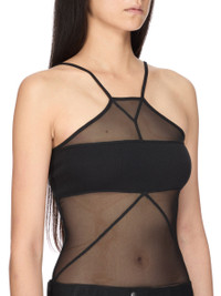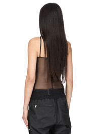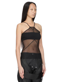 RICK OWENS SS26 TEMPLE SL COMBO TOP IN BLACK STRETCH TULLE AND CLASSIC RIB COTTON JERSEY THIS SL COMBO TOP IS HIP-LENGTH WITH A RAW CUT HEM. IT HAS A NECKLINE THAT CULMINATES IN A SHORT LEVEL LINE AT THE CENTRE FRONT NECK, WITH GEOMETRIC LINES AND TWO STRAPS WHICH RUN DIAGONALLY ACROSS THE SHOULDER TO THE BACK THEN FALL STRAIGHT DOWN. IT FEATURES THE SIGNATURE SEAM RUNNING DOWN THE CENTRE BACK SPINE. THIS IS A COMBINATION OF STRETCH TULLE AND CLASSIC RIB COTTON JERSEY. THIS LIGHTWEIGHT AND SHEER NYLON STRETCH TULLE HAS A SOFT HANDFEEL. THIS FABRIC IS MADE USING GRS CERTIFIED RECYCLED POLYAMIDE WHICH ENSURES A REDUCTION IN WATER CONSUMPTION, EMISSIONS AND HAZARDOUS WASTE, LESSENING THE DEPENDENCE ON NON-RENEWABLE RESOURCES. COLOR: BLACK MATERIAL: 93% NYLON + 7% ELASTANE DETAIL 100% COTTON MODEL IS 181CM TALL MODEL WEARS SIZE 40