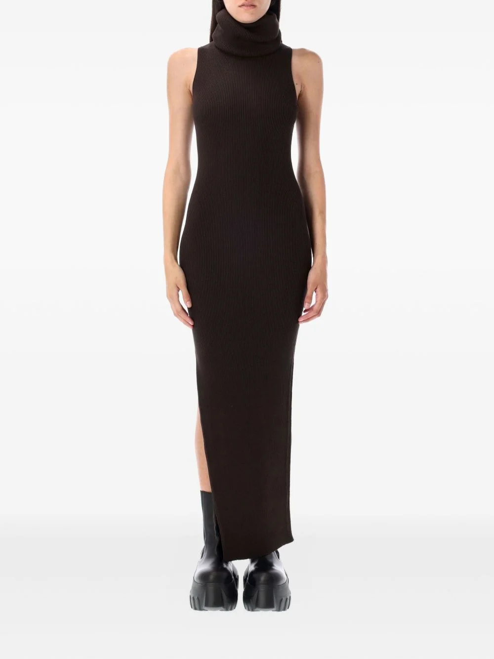 sleeveless maxi dress Highlights - Dark brown - Turtleneck - Sleeveless - Ribbed knit - Side slit Imported Composition Fabric 100%