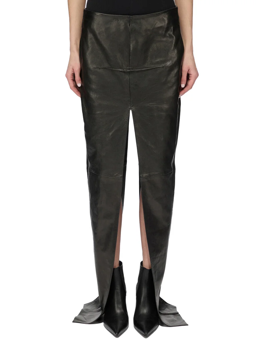 RICK OWENS FW25 CONCORDIANS RUNWAY SLICED SKIRT IN BLACK VEG NAPPA LAMB THIS SLICED SKIRT IS FLOOR LENGTH AT SIDES. IT HAS A CENTRE BACK ZIPPER AND A CLOSE TO THE BODY FIT. IT FEATURES TWO HIGH SLITS FRONT AND BACK AS WELL AS A FRONT AND BACK STITCH RIDGE DETAIL. IT HAS SIDE SEAM POCKETS. THIS MEDIUMWEIGHT LAMB LEATHER IS VEG TANNED AND FINISHED USING NATURAL WAXES AND ANILINE WHICH MAKES A SUPPLE HANDFEEL. BECAUSE THIS SKIN IS NAKED, NOT FINISHED USING ANY PIGMENTS COVERING THE SKIN, NATURAL MARKINGS AND SHADINGS ARE VISIBLE WHICH MAKES EACH SKIN AND PRODUCT UNIQUE VEG TANNING MEANS ONLY VEGETAL AND NATURAL TANNINS WERE USED IN THE PROCESS OF TANNING AND PRESERVING THIS LEATHER COLOR: BLACK MATERIAL: 100% LAMB LEATHER MODEL IS 181CM TALL MODEL WEARS SIZE 38