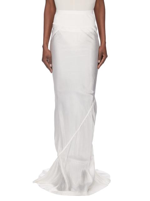 RICK OWENS SS26 TEMPLE SLIM LONG CODA IN MILK CUPRO SATIN THIS SLIM LONG CODA SKIRT IS FLOOR LENGTH WITH A WIDE RIBBING AND ELASTICIZED WAISTBAND. IT FALLS IN A SLIM COLUMN TO THE FLOOR AND FEATURES A DIAGONAL BIAS CUT SEAM WITH DRAPED INSERT AT MID BACK. THIS LIGHTWEIGHT AND FLUID CUPRO SATIN HAS A GLOSSY SURFACE, A SOFT HANDFEEL AND WASHED FINISH. THIS FABRIC IS MADE USING CUPRO WHICH IS BIODEGRADABLE AND 100% PLANT BASED. AS IT’S MADE FROM COTTON WASTE, CUPRO HELPS FIND A PURPOSE TO FIBERS THAT WOULD OTHERWISE BE DISCARDED. COLOR: MILK MATERIAL:100% CUPRO BAND 65% COTTON + 35% NYLON MODEL IS 181CM TALL MODEL WEARS SIZE 40