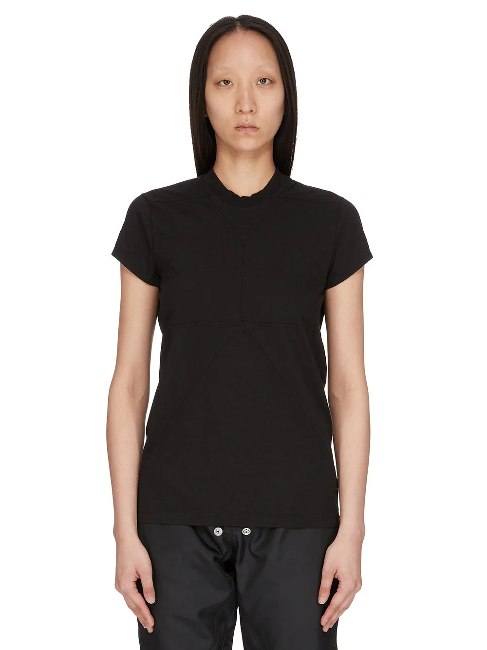 RICK OWENS SS26 TEMPLE SMALL LEVEL T IN BLACK MEDIUM WEIGHT COTTON JERSEY THIS SMALL LEVEL T IS HIP LENGTH WITH A SEMI-FITTED CUT, SHORT SLEEVES AND A RIBBED CREW NECK. IT FEATURES SIGNATURE FRONT LEVEL SHOULDER SEAMS AND A CENTRE BACK SEAM. THIS MEDIUMWEIGHT COTTON JERSEY HAS A COMPACT AND DRY HANDFEEL. THIS JERSEY IS GARMENT DYED. THIS FABRIC IS MADE USING GOTS CERTIFIED ORGANIC COTTON WHICH MEANS THE NATURAL FIBER IS GROWN WITHOUT HARMFUL CHEMICALS, LEAVING OUR SOIL, AIR AND WATER CLEANER FROM CONTAMINATES. COLOR: BLACK MATERIAL:100% COTTON MODEL IS 181CM TALL MODEL WEARS SIZE 40