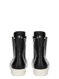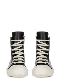 RICK OWENS SS25 HOLLYWOOD SNEAKERS IN BLACK/MILK/MILK WASHED CALF THESE SNEAKERS ARE ABOVE-ANKLE HEIGHT AND FEATURE SEVEN EYELETS, LACES, A ZIPPER ON THE INSIDE ANKLE FOR EASY FASTENING, TOE CAPS AND SHARK TOOTHED BUMPER SOLES THIS MEDIUMWEIGHT COW LEATHER IS VEG TANNED AND FINISHED USING NATURAL WAXES. A FINAL WASH GIVES THIS LEATHER ITS SOFTNESS AND BRINGS OUT THE NATURAL GRAIN TEXTURE OF EACH SKIN. BECAUSE THIS SKIN IS NAKED, NOT FINISHED USING ANY PIGMENTS COVERING THE SKIN, NATURAL MARKINGS AND SHADINGS ARE VISIBLE WHICH MAKES EACH SKIN AND PRODUCT UNIQUE. VEG TANNING MEANS ONLY VEGETAL AND NATURAL TANNINS WERE USED IN THE PROCESS OF TANNING AND PRESERVING THIS LEATHER. COLOR: BLACK/MILK/MILK MATERIAL: UPPER 100% CALF LEATHER TOE 100% CALF LEATHER LINING 100% CALF LEATHER INSOLE 100% CALF LEATHER SOLE 100% THERMOPLASTIC RUBBER
