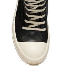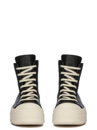 RICK OWENS SS26 TEMPLE MEGA BUMPER SNEAKS IN BLACK/MILK/MILK TUMBLED LAMB THESE MEGA BUMPER SNEAKS ARE ABOVE-ANKLE HEIGHT AND FEATURE SEVEN EYELETS, LACES, A ZIPPER ON THE INSIDE ANKLE FOR EASY FASTENING, TOE CAPS AND DOUBLE HEIGHT, SHARK-TOOTHED MEGA BUMPER SOLES THIS MEDIUMWEIGHT LAMB LEATHER IS VEG TANNED AND FINISHED WITH ANILINE. THE SURFACE TEXTURE, WHICH IS THE NATURAL GRAIN OF THE SKIN, IS ACHIEVED BY TUMBLING THE SKINS FOR 15 HOURS IN A WOODEN DRUM VEG TANNING MEANS ONLY VEGETAL AND NATURAL TANNINS WERE USED IN THE PROCESS OF TANNING AND PRESERVING THIS LEATHER THIS TANNERY IS LWG AUDITED COLOR: BLACK/MILK/MILK MATERIAL:UPPER 100% LAMB LEATHER TOE 100% CALF LEATHER LINING 100% CALF LEATHER INSOLE 100% CALF LEATHER SOLE 100% THERMOPLASTIC RUBBER SOLE HEIGHT 4.5CM