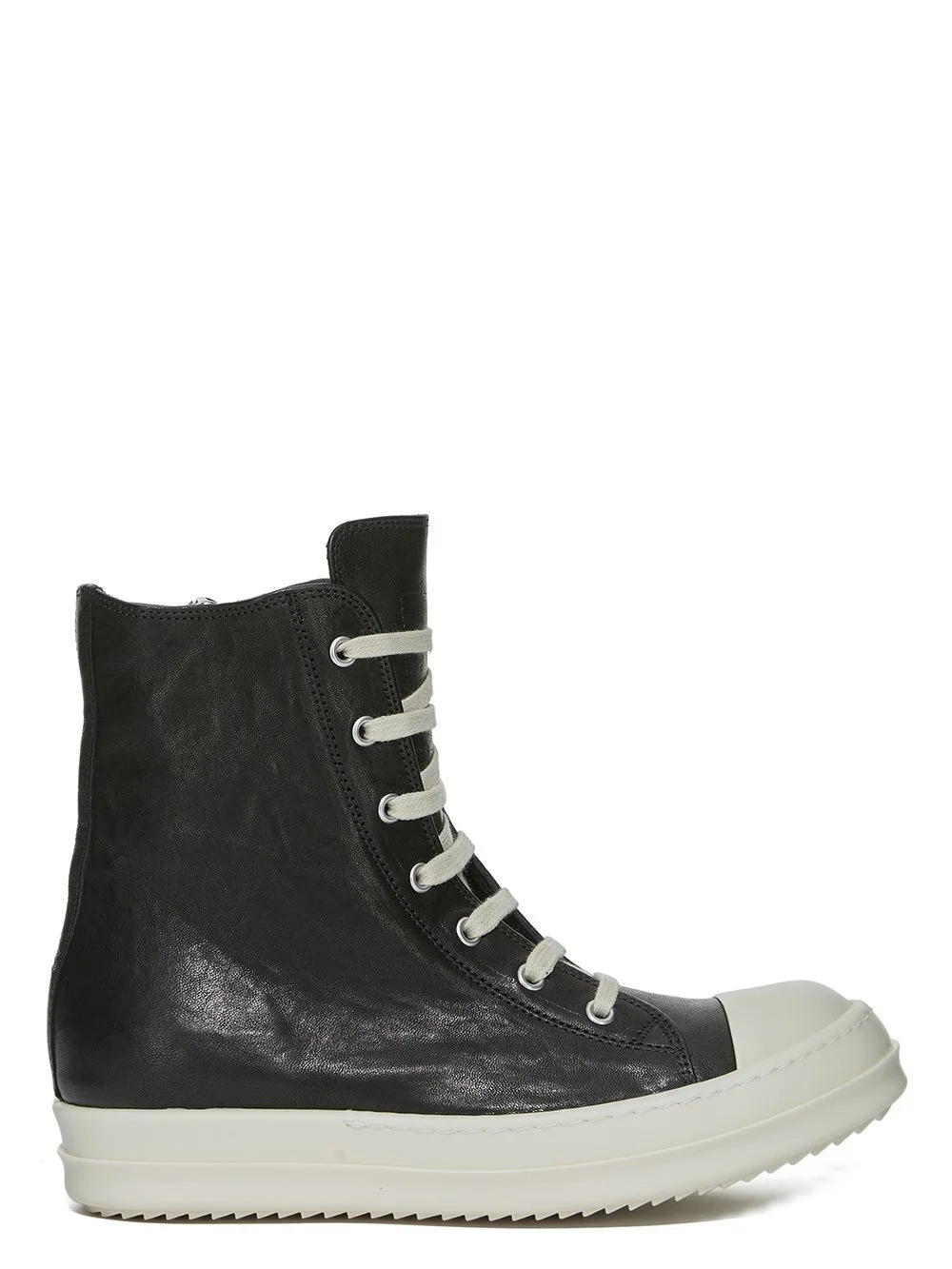 RICK OWENS FW25 CONCORDIANS SNEAKERS IN BLACK/MILK/MILK WAXY GOAT LEATHER THESE SNEAKERS ARE ABOVE-ANKLE HEIGHT AND FEATURE SEVEN EYELETS, LACES, A ZIPPER ON THE INSIDE ANKLE FOR EASY FASTENING, TOE CAPS AND SHARK-TOOTHED BUMPER SOLES THIS MEDIUMWEIGHT GOAT LEATHER IS VEGETALLY TANNED HAS A GRAINY TEXTURE AND IS FINISHED WITH NATURAL WAXES. THIS MEDIUMWEIGHT GOAT LEATHER IS VEG TANNED AND FINISHED USING NATURAL WAXES. IT HAS A SOFT HANDFEEL AND A NATURAL GRAIN TEXTURE. BECAUSE THIS SKIN IS NAKED, NOT FINISHED USING ANY PIGMENTS COVERING THE SKIN, NATURAL MARKINGS AND SHADINGS ARE VISIBLE WHICH MAKES EACH SKIN AND PRODUCT UNIQUE COLOR: BLACK/MILK/MILK MATERIAL: UPPER 100% RAM LEATHER TOE 100% CALF LEATHER LINING 100% CALF LEATHER INSOLE 100% CALF LEATHER SOLE 100% THERMOPLASTIC RUBBER SOLE HEIGHT 3.5CM