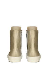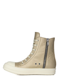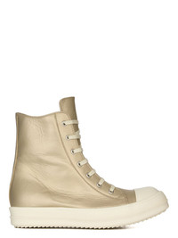 RICK OWENS SS25 HOLLYWOOD RUNWAY SNEAKERS IN GOLD/MILK/MILK METALLIC PEACHED LAMBSKIN THESE SNEAKERS ARE ABOVE-ANKLE HEIGHT AND FEATURE SEVEN EYELETS, LACES, A ZIPPER ON THE INSIDE ANKLE FOR EASY FASTENING, TOE CAPS AND SHARK-TOOTHED BUMPER SOLES THIS LIGHTWEIGHT LAMB LEATHER HAS A SOFT HANDFEEL ACHIEVED BY TUMBLING THE SKINS MULTIPLE TIMES IN A LARGE DRUM. IT IS FINISHED WITH A GUN METAL METALLIC SPRAY FINISH COLOR: GOLD/MILK/MILK MATERIAL: 100% LAMB LEATHER SOLE HEIGHT 3.5CM
