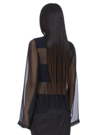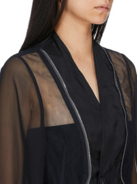 RICK OWENS SS26 TEMPLE STAG JKT IN BLACK TULLE AND VISCOSE SILK JERSEY THIS STAG JKT IS BELOW HIP LENGTH WITH LONG SLEEVES. IT HAS A ONE BUTTON FRONT CLOSURE, CREATING A V NECK. IT ALSO HAS A SHAPED ZIP DETAIL ON FRONT. ITS SLEEVES ARE AMPLE AND LOOSE, IT HAS A BACK YOKE, SIDE POCKETS AND FEATURES BACK PANELING. THIS IS A COMBINATION OF TULLE AND VISCOSE SILK JERSEY. THIS LIGHTWEIGHT AND SHEER NYLON TULLE HAS A STIFF HANDFEEL. IT IS MADE USING ECONYL® RECYCLED POLYAMIDE, MADE FROM 100% WASTE MATERIAL THAT WOULD OTHERWISE POLLUTE THE EARTH. COLOR: BLACK MATERIAL:FRONT 100% NYLON FRONT DETAIL 100% CUPRO BACK 93% NYLON + 7% ELASTANE SLEEVES 100% SILK YOKE LINING 100% COTTON BUTTONS 100% BUFFALO HORN MODEL IS 181CM TALL MODEL WEARS SIZE 40