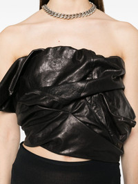 Draped Bustier leather top Highlights - Black - Calf leather - Draped design - Asymmetric design - Strapless - Cropped - Full lining - Concealed rear zip fastening Made in Italy Composition Lining: Polyamide 84%, Spandex/Elastane 16% Outer: Calf Leather 100% SIZE & FIT Model measurements Height 5 ft 11 in(1.8 m) Bust/Chest 31.49 in(80 cm) Hips 36.22 in(92 cm) Waist 25.59 in(65 cm) FittingInformation Designed for a close fit throughout The elasticated waist allows for a comfortable fit Soft leather has a supple and smooth construction offering some flexibility This piece fits true to size – take your usual size