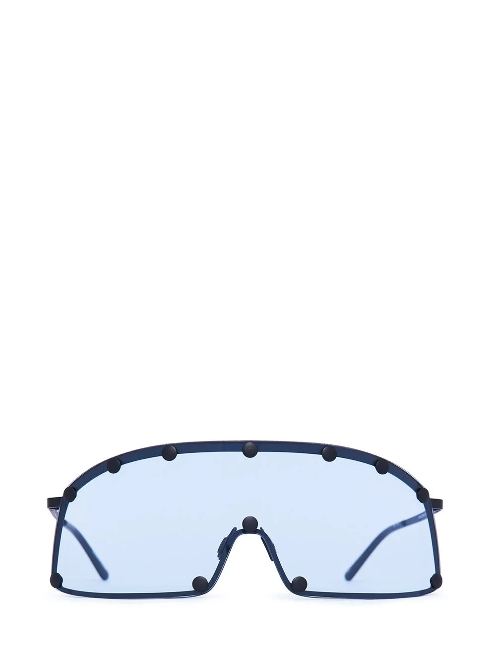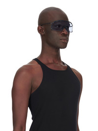 RICK OWENS SHIELDING SUNGLASSES THESE SUNGLASSES FEATURE A BLACK SURGICAL STAINLESS STEEL FRAME, A STRAIGHT-BOTTOMED BROWN LENSE AND A RUBBER NOSE PAD.THEY HAVE SLIM METAL ARMS WITH THE RICK OWENS LOGO ON THE INSIDE RIGHT TEMPLE. COLOR: BLACK, NUBLU BLUE. FRAME: 100% STAINLESS STEEL. LENSES: 100% NYLON. NOT SUITABLE FOR CONVERSION INTO PRESCRIPTION GLASSES