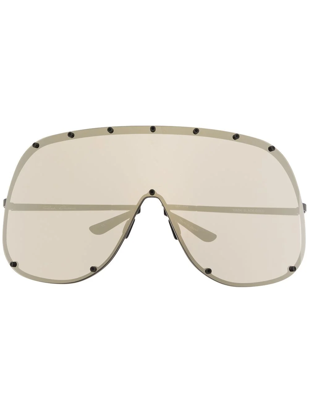 Shield sunglasses [ SKU: 10199318258 ] Elevate your accessory game with the Shield sunglasses by Rick Owens. This outstanding pair features tinted lenses and an oversized frame for a bold statement. The straight arms and curved tips provide both comfort and style, making them perfect for any modern wardrobe. Ideal for sunny days or as a chic addition to your look, these sunglasses are a must-have for those who appreciate distinctive design. Complete your outfit with these sunglasses for an effortlessly sophisticated appearance. Composition Metals & Alloys->stainless steel100 % Synthetic->Nylon100 % Reference RG0000006GBLKG0902 Made in Japan Size and Fit Arm Length: 11.4 Centimetres Bridge Width: 5.0 Centimetres Lens Diameter: 15.7 Centimetres Total Width: 15.7 Centimetres