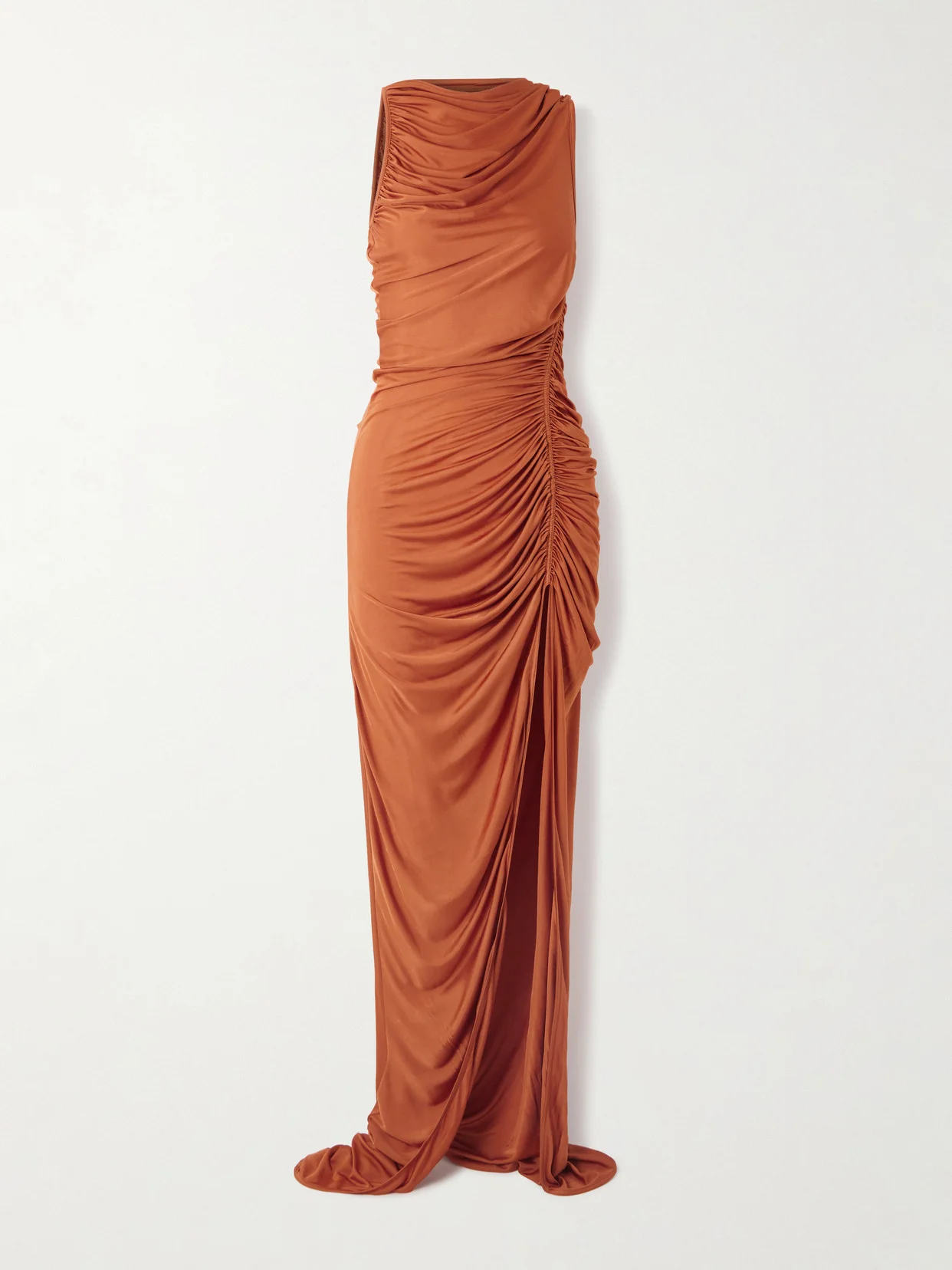 Rick Owens' 'Svita' dress channels the glamorous styles worn by ‘90s supermodels. Cut from orange jersey, it features a softly draped neckline and ruched bodice that accentuates the contours of your figure. The floor-sweeping hem calls for barely-there sandals.