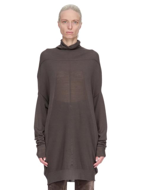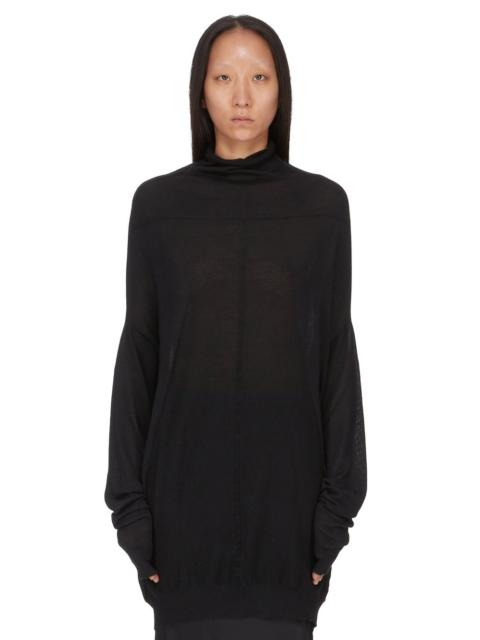 RICK OWENS FW25 CONCORDIANS LS TUBE IN BLACK RIBBED KNIT THIS LS TUBE IS BELOW HIP LENGTH AND HAS A CLOSE TO THE BODY FIT. IT IS A FULLY FASHIONED RIBBED KNIT WITH LONG SLEEVES AND A HIGH DRAPED FUNNEL NECK. IT HAS A SIGNATURE KNIT LINE RUNNING DOWN THE CENTRE BACK SPINE THIS LIGHTWEIGHT AND CLASSIC RIBBED WOOL KNIT HAS A SOFT HANDFEEL COLOR: BLACK MATERIAL: 100% NEW WOOL MODEL IS 181CM TALL MODEL WEARS SIZE S