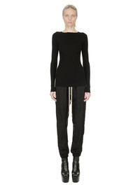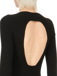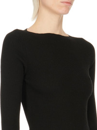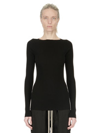 RICK OWENS SS24 LIDO AL TOP IN BLACK LIGHTWEIGHT RIBBED KNIT THIS AL TOP IS HIP LENGTH WITH A TIGHT FIT AND LONG SLEEVES, THAT GATHER AT THE WRISTS. IT HAS A WIDE BOAT NECK, AND A ROUND OPENING IN CENTRE BACK, WITH THE SIGNATURE KNIT CHANNEL RUNNING DOWN THE LOWER SPINE THIS IS A LIGHTWEIGHT AND SOFT CLASSIC RIBBED WOOL KNIT - COLOR: BLACK - MATERIAL: 100% NEW WOOL - MODEL IS 181CM TALL - MODEL WEARS SIZE S