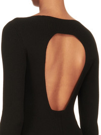 RICK OWENS FW24 PORTERVILLE AL TOP IN BLACK LIGHTWEIGHT RASATO RIBBED KNIT THIS AL TOP IS HIP-LENGTH WITH A CLOSE FIT, AND LONG SLEEVES. IT HAS A WIDE BOAT NECK, AND A ROUND OPENING IN CENTRE BACK, WITH THE SIGNATURE KNIT CHANNEL RUNNING DOWN THE LOWER SPINE THIS IS A LIGHTWEIGHT AND SOFT CLASSIC RIBBED WOOL KNIT - COLOR: BLACK - MATERIAL: 100% NEW WOOL - MODEL IS 181CM TALL - MODEL WEARS SIZE S