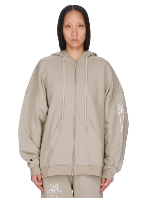 CHAMPION X RICK OWENS SS25 JUMBO JASON'S HOODIE IN PEARL COMPACT FELPA JERSEY IT FEATURES A 3D EMBROIDERED SIGNATURE CHAMPION X RICK OWENS PENTAGRAM LOGO ON THE LEFT UPPER ARM AND CHAMPION LOGO ON RIGHT WRIST THIS HEAVYWEIGHT JERSEY IS COMPACT WITH A DRY HANDFEEL THIS JERSEY IS MADE USING CERTIFIED ORGANIC COTTON WHICH MEANS THE NATURAL FIBER IS GROWN WITHOUT HARMFUL CHEMICALS, LEAVING OUR SOIL, AIR AND WATER CLEANER FROM CONTAMINATES COLOR: PEARLMATERIAL: 100% COTTON INSERTS 96% COTTON + 4% ELASTANE MODEL WEARS SIZE M MODEL IS 181CM TALL