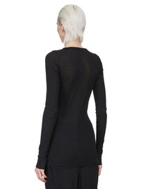 RICK OWENS FOREVER RIB LS T IN MINI RIB JERSEY THIS RIB LS T IS BELOW HIP LENGTH WITH A SLIM FIT AND LONG SLEEVES. IT HAS A RIBBED ROUND NECK, RAW CUT HEM AND CUFFS. IT FEATURES THE SIGNATURE SINGLE SEAM RUNNING DOWN CENTRE BACK SPINE THIS LIGHTWEIGHT MINI RIB JERSEY HAS A TEXTURED SURFACE AND SOFT HANDFEEL. THIS JERSEY IS MADE USING GOTS CERTIFIED ORGANIC COTTON WHICH MEANS THE NATURAL FIBER IS GROWN WITHOUT HARMFUL CHEMICALS, LEAVING OUR SOIL, AIR AND WATER CLEANER FROM CONTAMINATES WE STRIVE TO KEEP OUR PRODUCTION AS LOCAL AS POSSIBLE. THE FULL MANUFACTURING CYCLE OF THIS PRODUCT, FROM THE MATERIAL KNITTING TO SEWING AND FINISHING, WAS UNDERTAKEN CLOSE TO OUR HOME BASE IN CONCORDIA, ITALY. - COLOR:BLACK - MATERIAL: 100% COTTON - MODEL IS WEARING SIZE 40 - MODEL IS 181 CM TALL