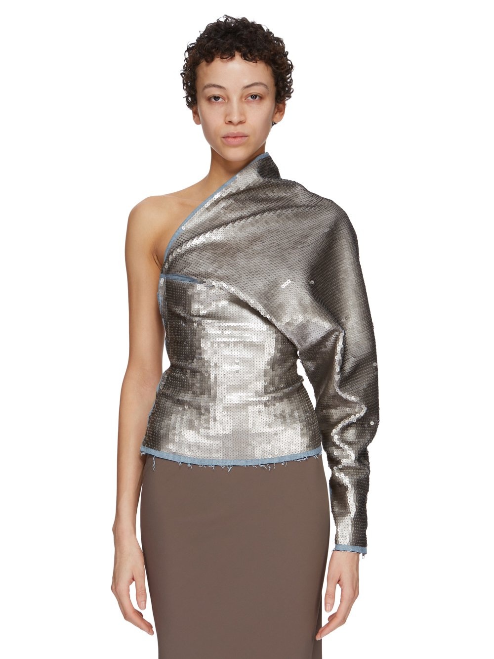 RICK OWENS FW23 LUXOR RUNWAY ONE SLEEVE TOP IN BLUE AND PEARL SEQUIN EMBROIDERED STRETCH DENIM THIS ONE SLEEVE TOP IS HIP LENGTH WITH A TIGHT FIT. IT HAS AN ASYMMETRICAL NECKLINE WITH ONE SHOULDER. IT DRAPES VERY SLIGHTLY ACROSS THE CHEST, BALLOONING INTO A DRAPED SHOULDER WITH A SINGLE LEFT LONG SLEEVE, WITH AN EXPOSED ZIPPERED CUFF. IT CLOSES WITH A SIDE ZIPPER ON THE RIGHT THIS VERSION IS MADE FROM SEQUIN EMBROIDERED FABRIC WITH AN ENGINEERED TECHNIQUE WHEREBY EACH OF THE GARMENTS' PANELS IS EMBROIDERED SEPARATELY BEFORE CONSTRUCTION, LEAVING VISIBLE SLIGHT TRACING OF THE BASE FABRIC UNDERNEATH AROUND THE SEAM LINES THIS LIGHTWEIGHT STRETCH DENIM IS EMBROIDERED WITH SMALL ORNAMENTAL SEQUIN DISKS - COLOR: BLUE/PEARL - MATERIAL: 91% COTTON + 6% ELASTOMULTIESTER + 3% RUBBER - EMBROIDERY 100% POLYESTER - MODEL IS WEARING SIZE 40 - MODEL IS 181 CM TALL