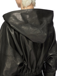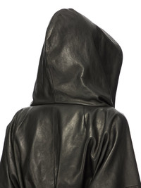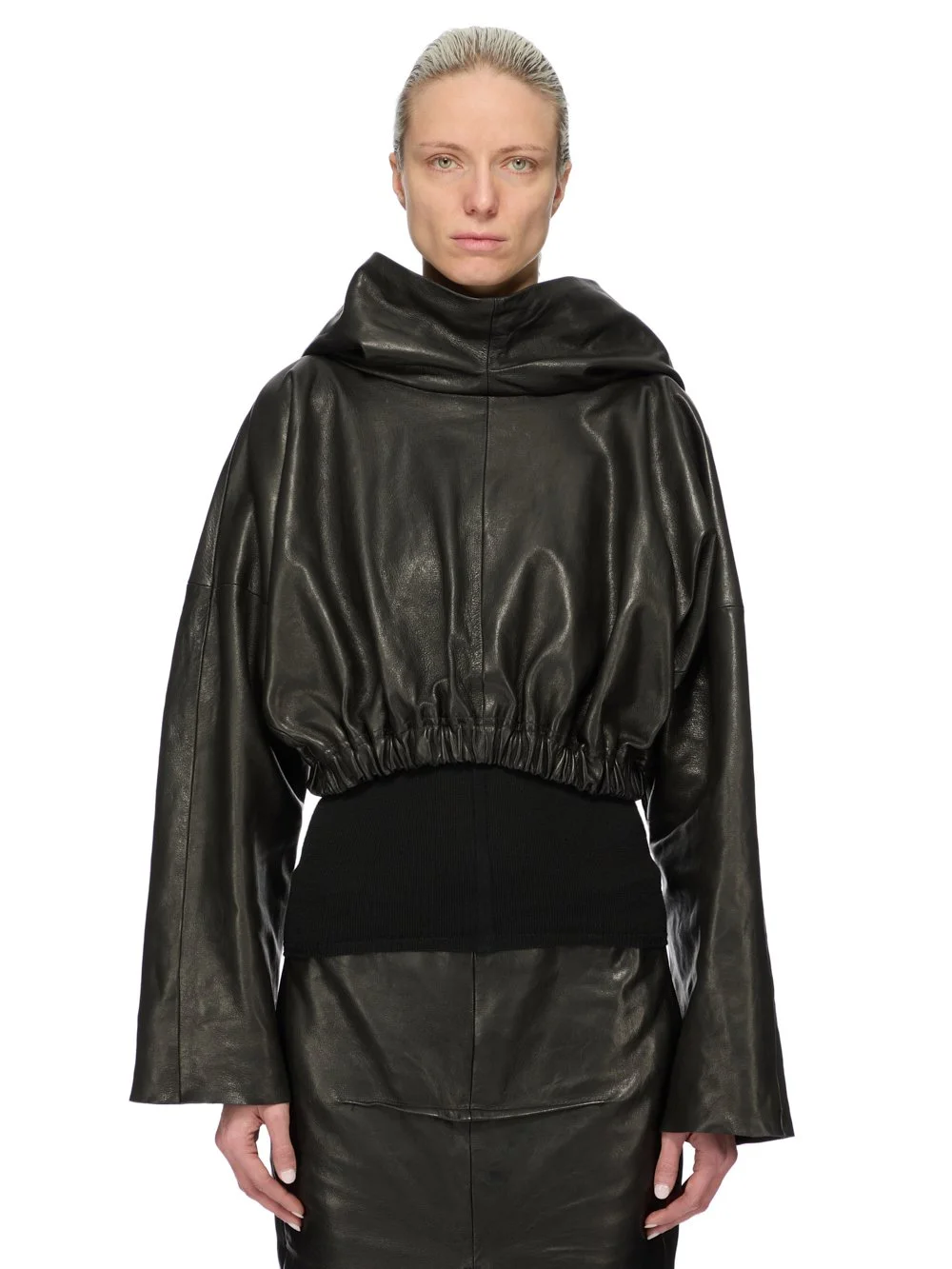 RICK OWENS FW25 CONCORDIANS RUNWAY CROPPED HOODED TUNIC IN BLACK VEG NAPPA LAMB THIS CROPPED HOODED TUNIC IS WAIST LENGTH WITH LONG, WIDE SLEEVES. IT HAS A LARGE HOOD THAT DRAPES AT THE FRONT NECK, AND A WIDE SQUARE BODY THAT GATHERS IN AT THE WAIST ON AN ELASTICATED WAISTBAND THIS MEDIUMWEIGHT LAMB LEATHER IS VEG TANNED AND FINISHED USING NATURAL WAXES AND ANILINE WHICH MAKES A SUPPLE HANDFEEL. BECAUSE THIS SKIN IS NAKED, NOT FINISHED USING ANY PIGMENTS COVERING THE SKIN, NATURAL MARKINGS AND SHADINGS ARE VISIBLE WHICH MAKES EACH SKIN AND PRODUCT UNIQUE VEG TANNING MEANS ONLY VEGETAL AND NATURAL TANNINS WERE USED IN THE PROCESS OF TANNING AND PRESERVING THIS LEATHER COLOR: BLACK MATERIAL: 100% LAMB LEATHER MODEL IS 181CM TALL ITEM IS AVAILABLE IN ONE SIZE