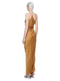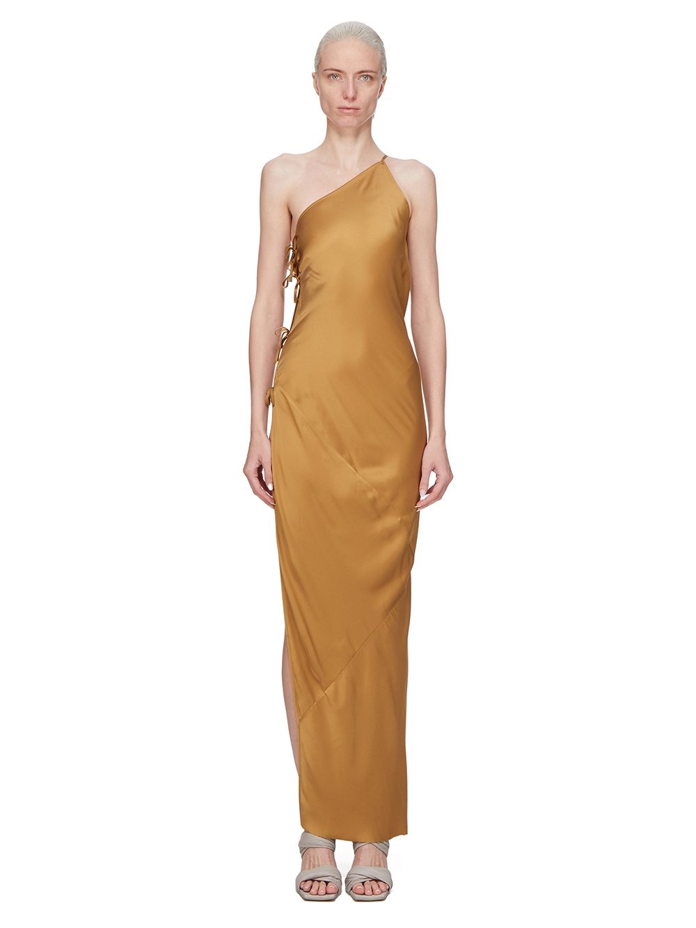 RICK OWENS FW24 PORTERVILLE TACO DRESS IN HONEY WASHED CHARMEUSE THIS TACO DRESS IS ANKLE LENGTH WITH AN ASYMMETRICAL NECKLINE AND ONE THIN SHOULDER STRAP. IT FEATURES AN OPEN RIGHT SIDE BODY THAT SECURES WITH TIES ALL THE WAY DOWN TO THE HIP, WITH A SKIRT THAT TAPERS SLIGHTLY TO THE HEM THIS LIGHTWEIGHT AND FLUID CHARMEUSE HAS A SEMI-SHINY SURFACE AND WASHED FINISH. THIS FABRIC IS MADE FROM CERTIFIED VISCOSE WHICH ENSURES THAT THE FIBERS ARE PRODUCED FROM RESPONSIBLY MANAGED SOURCES AND NO DEFORESTATION OCCURS COLOR: HONEY MATERIAL: 61% ACETATE + 39% VISCOSE MODEL IS 181CM TALL MODEL WEARS SIZE 40