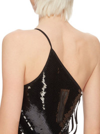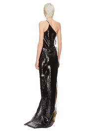 RICK OWENS FW24 PORTERVILLE TACO GOWN IN BLACK CHIFFON EMBROIDERED THIS TACO GOWN TRAILS FLOOR LENGTH AND HAS AN ASYMMETRICAL NECKLINE AND ONE THIN SHOULDER STRAP. IT FEATURES AN OPEN RIGHT SIDE BODY THAT SECURES WITH TIES ALL THE WAY DOWN TO THE HIP, AND A SKIRT THAT TAPERS TO THE FLOOR THIS SEMI-TRANSPARENT SILK CHIFFON IS EMBROIDERED WITH SMALL ORNAMENTAL SEQUIN DISKS. IT IS WOVEN IN THE COMO REGION OF ITALY KNOWN FOR ITS HERITAGE OF SILK PRODUCTION AND IS MADE USING GOTS CERTIFIED ORGANIC SILK WHICH MEANS THE NATURAL FIBER IS MADE WITHOUT HARMFUL CHEMICALS, LEAVING OUR SOIL, AIR AND WATER CLEANER FROM CONTAMINATES COLOR: BLACK MATERIAL: 100% SILK EMBROIDERY: 100% POLYESTER MODEL IS 181CM TALL MODEL WEARS SIZE 40