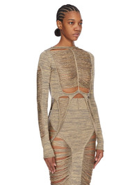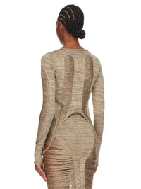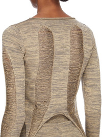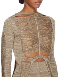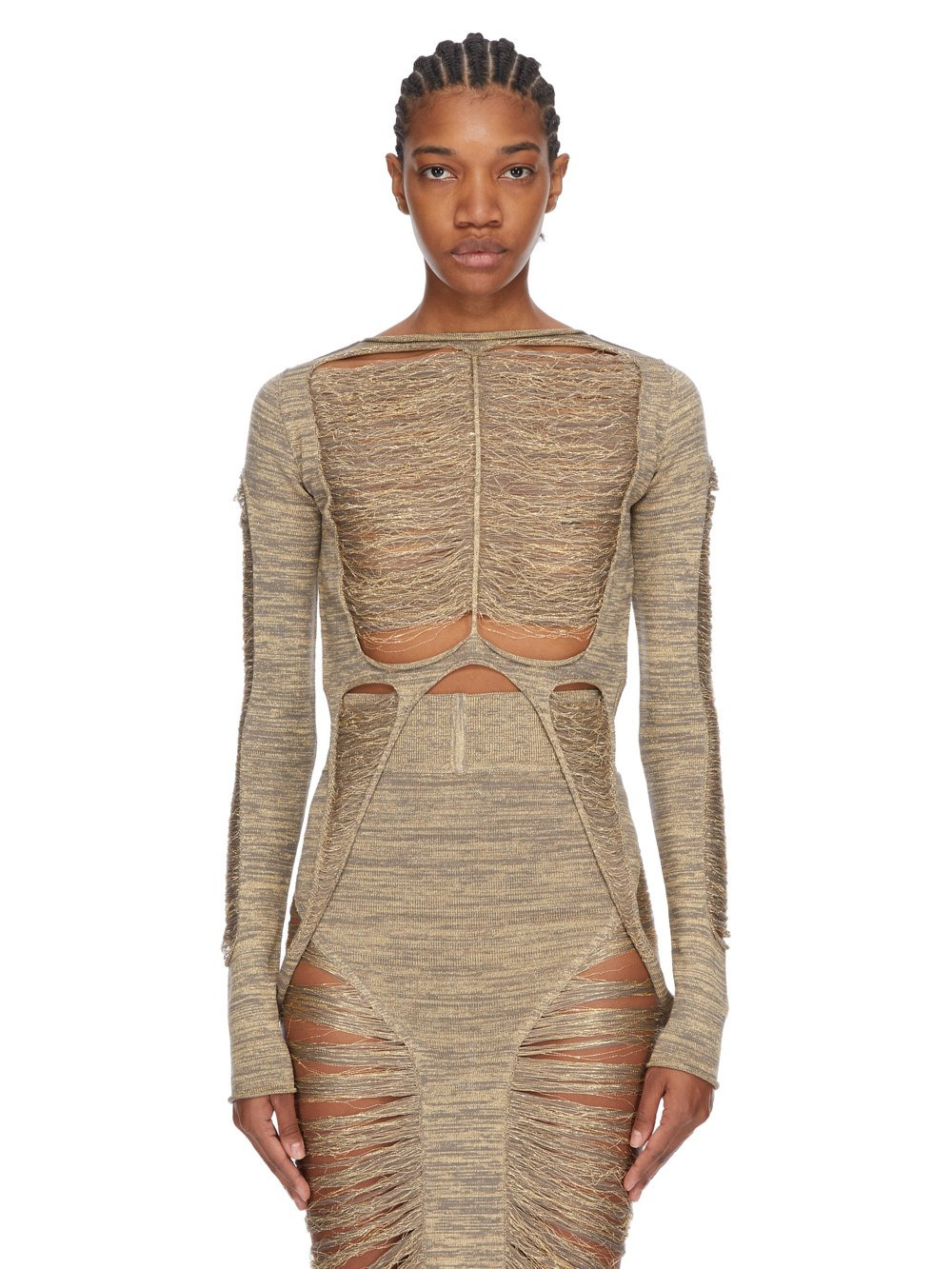 RICK OWENS SS25 HOLLYWOOD RUNWAY ANJA LS T IN GOLD SHREDDED GOLD KNIT THIS TANJA LS T IS WAIST LENGTH AT FRONT AND SLIGHTLY LONGER IN THE BACK. IT HAS A ROLLED BOAT NECK AND LONG SLEEVES. THIS SLEEVELESS TOP FEATURES A SHREDDED FRONT AND BACK, WITH SIDE LOOPS THAT HANG DOWN TO BELOW HIP LENGTH, A CENTRE FRONT LINE AND CHANEL ON THE BACK. IT IS BODY REVEALING ON FRONT AND BACK THIS MEDIUMWEIGHT WOOL AND GOLD LUREX BLEND KNIT HAS A SOFT HANDFEEL. IT IS KNITTED IN AN OPEN RIB PATTERN THAT VARIES THROUGHOUT THE GARMENT. COLOR: GOLD MATERIAL: 52% NEW WOOL + 37% VISCOSE + 11% POLYESTER MODEL IS 181CM TALL MODEL WEARS SIZE S