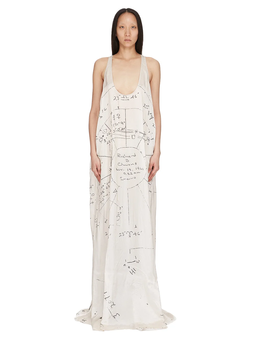 RICK OWENS SS26 TEMPLE TANK GOWN IN MILK/BLACK PRINTED CUPRO TWILL THIS TANK GOWN IS FLOOR LENGTH AND DRAPES AND POOLS AT THE BOTTOM. IT HAS A LOW ROUNDED SCOOP NECKLINE, THIN SHOULDER STRAPS THAT FLOW INTO A SLIGHT RACER BACK AND LOW ARMHOLES. IT FEATURES THE SIGNATURE SINGLE SEAM RUNNING DOWN THE CENTER BACK SPINE AND SIDE SEAM POCKETS. THIS GOWN FEATURES AN EXACT COPY OF RICK OWENS’ ASTROLOGICAL NATAL CHART, HAND-DRAWN BY HIS FATHER JOHN ON THE DAY OF HIS BIRTH IN 1961. THIS LIGHTWEIGHT AND FLUID VISCOSE AND CUPRO TWILL HAS A GLOSSY SURFACE, A SOFT HANDFEEL AND WASHED FINISH. IT IS DIGITALLY PRINTED WITH OUR SEASONAL ASTRO MOTIF. THIS FABRIC IS MADE USING CERTIFIED VISCOSE AND CUPRO WHICH IS BIODEGRADABLE AND 100% PLANT BASED. AS IT’S MADE FROM COTTON WASTE, CUPRO HELPS FIND A PURPOSE TO FIBERS THAT WOULD OTHERWISE BE DISCARDED. COLOR: MILK/BLACK MATERIAL:52% VISCOSE + 48% CUPRO MODEL IS 181CM TALL MODEL WEARS SIZE 40