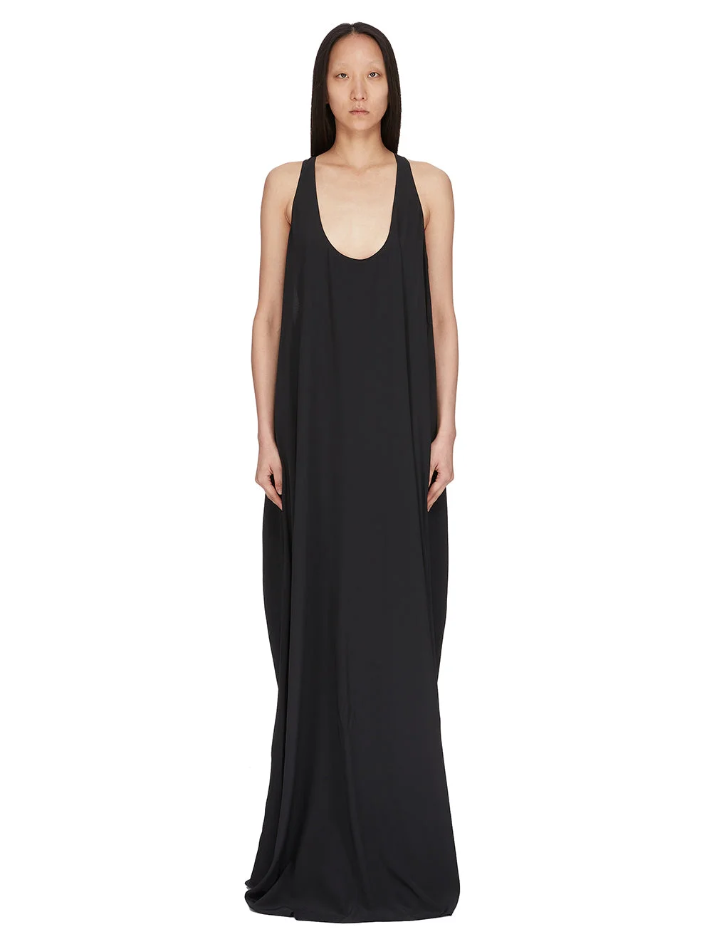RICK OWENS SS26 TEMPLE TANK GOWN IN BLACK COCOON CREPE THIS TANK GOWN IS FLOOR LENGTH AND DRAPES AND POOLS AT THE BOTTOM. IT HAS A LOW ROUNDED SCOOP NECKLINE, THIN SHOULDER STRAPS THAT FLOW INTO A SLIGHT RACER BACK AND LOW ARMHOLES. IT FEATURES THE SIGNATURE SINGLE SEAM RUNNING DOWN THE CENTER BACK SPINE AND SIDE SEAM POCKETS. THIS LIGHTWEIGHT AND FLUID SILK BLEND CREPE IS MATTE AND HAS A DRY HANDFEEL. THIS FABRIC IS MADE FROM FSC® - CERTIFIED (FSC - C162846) ACETATE WHICH ENSURES THAT THE FIBERS ARE PRODUCED FROM RESPONSIBLY MANAGED SOURCES AND NO DEFORESTATION OCCURS. COLOR: BLACK MATERIAL:64% ACETATE + 36% SILK MODEL IS 181CM TALL MODEL WEARS SIZE 40