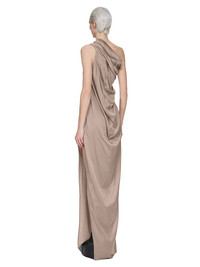RICK OWENS SS25 HOLLYWOOD ATHENA ARROWHEAD IN FLESH WASHED CHARMEUSE THIS ATHENA ARROWHEAD IS FLOOR-LENGTH. IT HAS ONE RIGHT SHOULDER WITH AN ASYMMETRICAL NECKLINE THAT DRAPES ACROSS THE BODY. IT FEATURES A SKIRT WITH TWO HIGH SIDE SLITS WHICH TAPERS SLIGHTLY TO THE FLOOR WITH A CENTER BACK SEAM THIS LIGHTWEIGHT AND FLUID CHARMEUSE HAS A SEMI-SHINY SURFACE AND WASHED FINISH. THIS FABRIC IS MADE FROM CERTIFIED VISCOSE WHICH ENSURES THAT THE FIBERS ARE PRODUCED FROM RESPONSIBLY MANAGED SOURCES AND NO DEFORESTATION OCCURS COLOR: FLESH MATERIAL: 61% ACETATE + 39% VISCOSE MODEL IS 181CM TALL MODEL WEARS SIZE 38