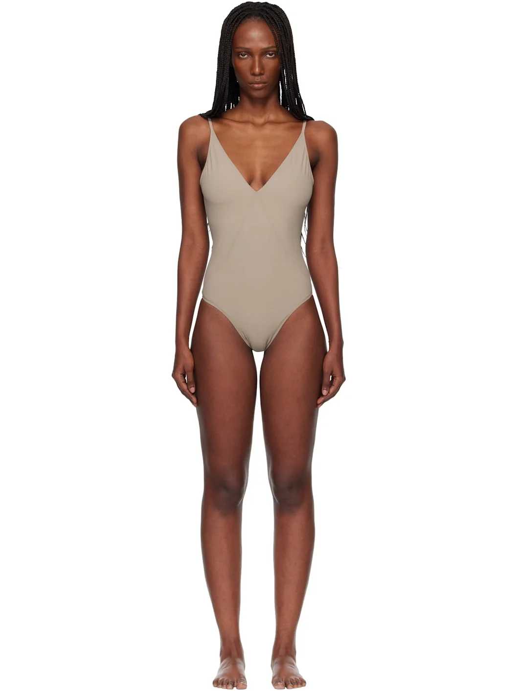 Stretch ECONYL® recycled nylon jersey one-piece swimsuit. · Plunging V-neck · Fixed spaghetti straps · Low back Supplier color: Taupe 79% recycled nylon, 21% elastane. Made in Italy 261232F103001