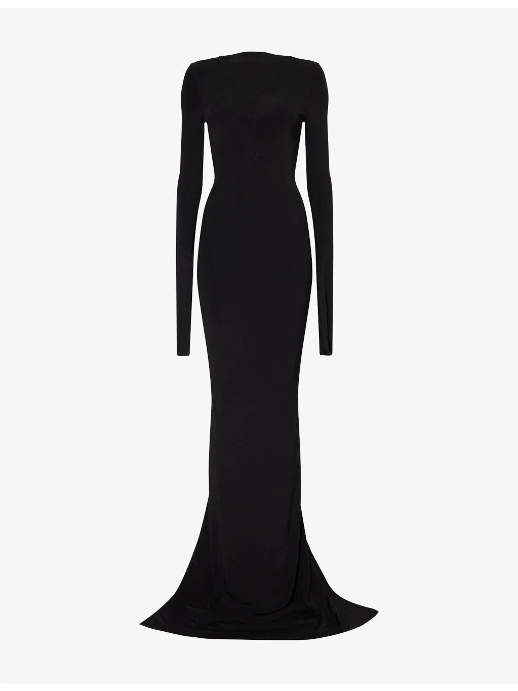 PRODUCT DETAILS - Rick Owens stretch-woven gown - 96% viscose, 4% elastane - Fitted, high neck, extra long sleeves, split hem, panelled construction - Hand wash - Made in Italy - True to size - Size UK 8: length 70in / 177cm - Model is 5ft 10in/1.78m and wears a size UK 8 - Lightweight, stretchy Ref: R04618960