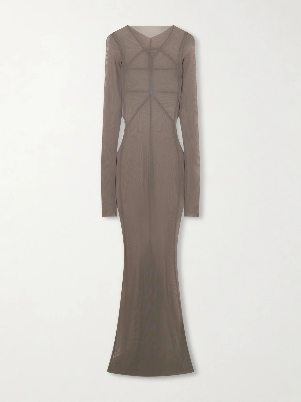 Dark romanticism defines the work of Rick Owens. The 'Temple Gown' sheer maxi dress is crafted from stretch tulle in a close, second-skin silhouette with floor-length proportions and extended sleeves. Paneled seams trace the body's natural lines through the translucent fabric.
