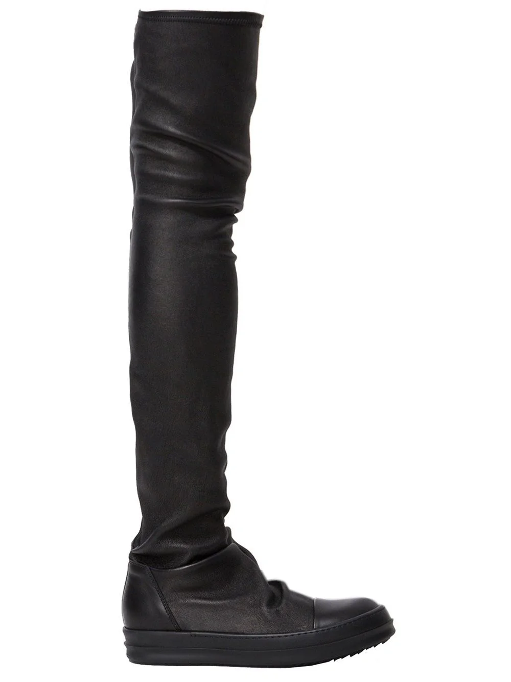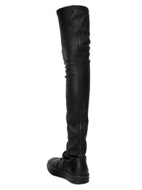 thigh high sneaker boots Black stretch cotton, calf leather and sheep skin thigh high sneaker boots from Rick Owens featuring a pull-on style, a rubber sole and a rubber toe cap. This item fits small, please select half a size up. Made in Italy Composition Lining: Calf Leather 100% Sole: Rubber 100% Outer: Sheep Skin/Shearling 65%, Cotton 34%, Spandex/Elastane 1% SIZE & FIT Measurement Sole height 1.18 in(3 cm) HEIGHT 24.4 in(62 cm)
