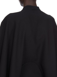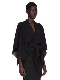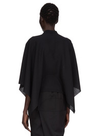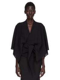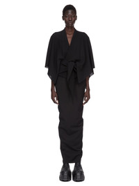RICK OWENS FW25 CONCORDIANS HALF MOON TOP IN BLACK WOOL SABLE THIS HALF MOON TOP IS BELOW WAIST LENGTH WITH LONG WIDE, KIMONO SLEEVES. IT HAS A V NECK THAT DESCENDS TO LONG TIES THAT ARE DESIGNED TO TWIST, AND WRAP AROUND THE BODY, TYING AT THE FRONT THIS MEDIUMWEIGHT WOOL SABLE FABRIC IS WOVEN WITH HIGH TWIST CREPE YARNS THAT CREATE A DRY HANDFEEL AND TEXTURED SURFACE. IT IS WOVEN IN THE BIELLA REGION OF ITALY RENOWNED FOR ITS LONG TRADITION OF TAILORED WOOL THIS FABRIC IS MADE FROM ZQ CERTIFIED VIRGIN WOOL WHICH ENSURES A HIGH STANDARD IN ANIMAL WELFARE, ENVIRONMENTAL SUSTAINABILITY AND SOCIAL RESPONSIBILITY. EACH BALE OF WOOL IS TRACEABLE BACK TO ITS SOURCE COLOR: BLACK MATERIAL: 100% NEW WOOL MODEL IS 181CM TALL MODEL WEARS SIZE 40