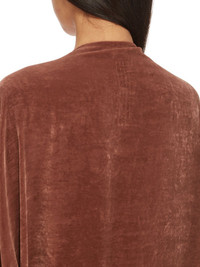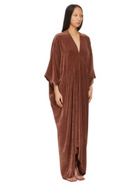 RICK OWENS FW24 PORTERVILLE TOMMYKITE GOWN IN THROAT VELVET THIS TOMMYKITE GOWN IS ANKLE-LENGTH WITH A SLIGHT RISE IN THE CENTRE FRONT. IT FEATURES CENTRE FRONT DRAPING GATHERED INTO A SEAM WHICH COMES TO A POINT BETWEEN THE BUST. IT HAS A V NECK, A DROPPED SHOULDER WITH WIDE THREE QUARTER TOMMY SLEEVES AND A VOLUMINOUS FIT THIS LIGHTWEIGHT AND FLUID VELVET HAS A SOFT AND WASHED UNEVEN FINISH. THIS FABRIC IS MADE FROM CERTIFIED VISCOSE WHICH ENSURES THAT THE FIBERS ARE PRODUCED FROM RESPONSIBLY MANAGED SOURCES AND NO DEFORESTATION OCCURS COLOR: THROAT MATERIAL: 82% VISCOSE 18% SILK MODEL IS 181CM TALL MODEL WEARS SIZE 40