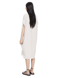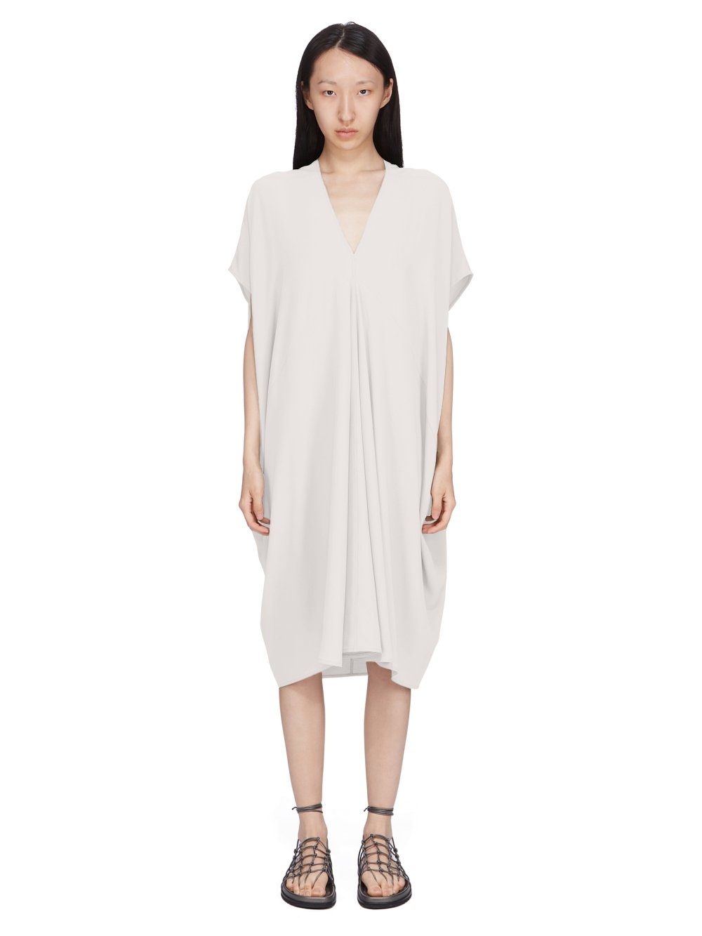 RICK OWENS SS25 HOLLYWOOD SL TOMMYKITE V DRESS IN DINGE COCOON CREPE THIS SL TOMMYKITE V DRESS IS ABOVE-KNEE LENGTH WITH A SLIGHT RISE IN THE CENTER FRONT. IT FEATURES CENTER FRONT DRAPING GATHERED INTO A SEAM THAT COMES TO A POINT BETWEEN THE BUST. IT HAS A V NECK AND A VOLUMINOUS FIT WITH WIDE SHOULDERS THAT CREATE SOFT CAP SLEEVES THIS LIGHTWEIGHT AND FLUID SILK BLEND CREPE HAS A DRY AND MATTE FINISH. THIS FABRIC IS MADE FROM FSC® CERTIFIED ACETATE WHICH ENSURES THAT THE FIBERS ARE PRODUCED FROM RESPONSIBLY MANAGED SOURCES AND NO DEFORESTATION OCCURS COLOR: DINGE MATERIAL: 64% ACETATE + 36% SILK MODEL IS 181CM TALL MODEL WEARS SIZE 40