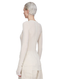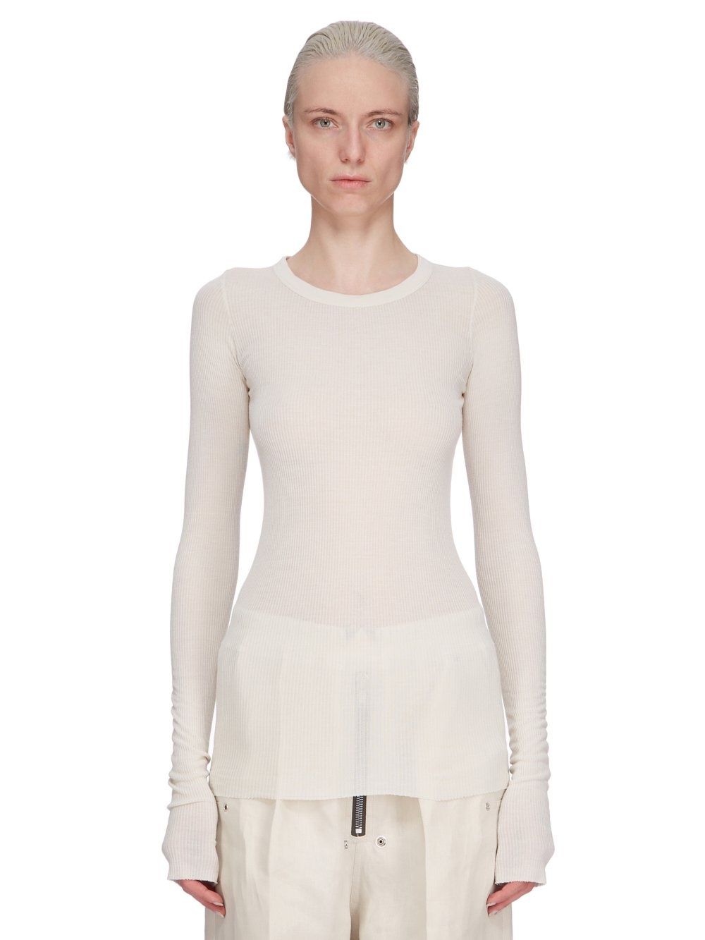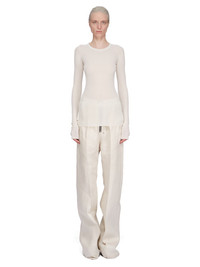 RICK OWENS SS25 HOLLYWOOD RIB LS T IN DINGE VISCOSE SILK RIB JERSEY THIS RIB LS T IS BELOW-HIP LENGTH WITH A SLIM FIT AND LONG SLEEVES. IT HAS A RIBBED ROUND NECK, RAW CUT HEM AND CUFFS, AND FEATURES THE SIGNATURE SINGLE SEAM RUNNING DOWN CENTER BACK SPINE THIS LIGHTWEIGHT VISCOSE AND SILK RIB JERSEY HAS A DISTINCT RIB PATTERN AND SOFT HANDFEEL THIS JERSEY IS MADE FROM FSC® - CERTIFIED (FSC - C162846) VISCOSE WHICH ENSURES THAT THE FIBERS ARE PRODUCED FROM RESPONSIBLY MANAGED SOURCES AND NO DEFORESTATION OCCURS. WE STRIVE TO KEEP OUR PRODUCTION AS LOCAL AS POSSIBLE. THE FULL MANUFACTURING CYCLE OF THIS PRODUCT, FROM THE MATERIAL KNITTING TO SEWING AND FINISHING, WAS UNDERTAKEN CLOSE TO OUR HOME BASE IN CONCORDIA, ITALY COLOR: DINGE MATERIAL: 88% VISCOSE + 12% SILK MODEL IS 181CM TALL MODEL WEARS SIZE 40