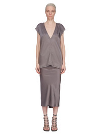 RICK OWENS SS25 HOLLYWOOD DYLAN TOP IN DUST WASHED CHARMEUSE THIS DYLAN TOP IS HIP LENGTH. IT HAS A DEEP V NECK WITH WIDE, SLEEVELESS, SHOULDERS. IT FEATURES SEAMS RUNNING DOWN THE CENTER FRONT AND CENTER BACK SPINE THIS LIGHTWEIGHT AND FLUID CHARMEUSE IS HAS A SEMI-SHINY SURFACE AND WASHED FINISH. THIS FABRIC IS MADE FROM CERTIFIED VISCOSE WHICH ENSURES THAT THE FIBERS ARE PRODUCED FROM RESPONSIBLY MANAGED SOURCES AND NO DEFORESTATION OCCURS COLOR: DUST MATERIAL: 61% ACETATE + 39% VISCOSE MODEL IS 181CM TALL MODEL WEARS SIZE 40