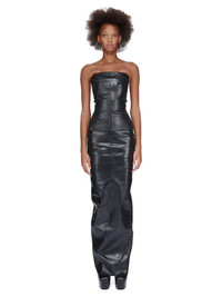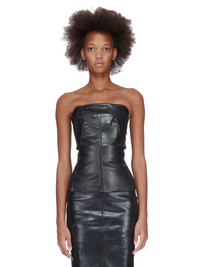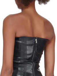 RICK OWENS FW23 LUXOR BUSTIER TOP IN BLACK CRACKED STRETCH DENIM THIS BUSTIER TOP IS HIP LENGTH WITH A CLOSE TO THE BODY FIT. ITS STRAPLESS BUSTIER TOP HAS A SIGNATURE GEO SEAM RUNNING ACROSS THE FRONT CHEST AND SLANTING DIAGONALLY DOWN THE SIDE BODY. IT HAS AN EXPOSED CENTRE BACK ZIPPER AND RAW CUT HEM. THIS LIGHTWEIGHT STRETCH DENIM HAS A SOFT, MATTE FILM OVERLAY. AFTER THE DENIM BASE IS OVER DYED AND COATED WITH A DARK GLUE, THE FILM IS APPLIED BY HEAT PRESS AND TUMBLED TO CREATE THE SOFT HAND FEEL AND CRACKED EFFECT. SINCE THE FILM IS APPLIED DIRECTLY ON THE READY GARMENT, SEAMS AND DETAILS MAKE THE APPLICATION IRREGULAR, EXPOSING THE UNDERLYING DENIM IN CERTAIN AREAS. THIS IS AN INHERENT CHARACTERISTIC OF THIS TYPE OF TREATMENT AND IS A DESIRED VISUAL ASPECT WHICH MAKES EACH PIECE UNIQUE - COLOR: BLACK - MATERIAL: 91% COTTON + 6% ELASTOMULTIESTER + 3% RUBBER - INNER BUSTIER 78% NYLON + 22% ELASTANE - MODEL IS WEARING SIZE 40 - MODEL IS 181 CM TALL