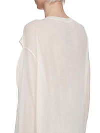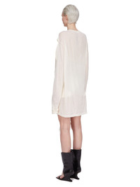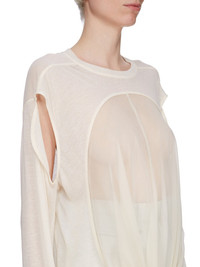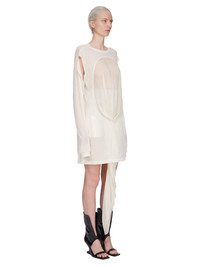 RICK OWENS SS25 HOLLYWOOD DRAIN T IN NATURAL/DINGE UNSTABLE COTTON AND SILK CHIFFON THIS DRAIN T IS MID-THIGH LENGTH. IT HAS A ROUND RIBBED CREWNECK, AND LONG CAPE SLEEVES, WITH OPENINGS AT THE FRONT ARMHOLE, SO ARMS CAN BE WORN IN OR OUT. IT FEATURES A LARGE ROUND SEAM ON THE CENTER FRONT BODY WITH A PANEL THAT DRAPES DOWNWARDS INSIDE LIKE A DRAIN, AND FALLS OUT BELOW THE HEM, FINISHING AT ANKLE LENGTH. IT HAS RIB CUFFS, SIGNATURE LEVEL SHOULDER SEAMS, AND SEAM DOWN THE CENTER BACK SPINE THIS IS A COMBINATION OF UNSTABLE COTTON AND SILK CHIFFON. THIS LIGHTWEIGHT COTTON JERSEY IS SEMI-TRANSPARENT WITH A SOFT HANDFEEL. THIS JERSEY IS MADE USING GOTS CERTIFIED ORGANIC COTTON WHICH MEANS THE NATURAL FIBER IS GROWN WITHOUT HARMFUL CHEMICALS, LEAVING OUR SOIL, AIR AND WATER CLEANER FROM CONTAMINATES WE STRIVE TO KEEP OUR PRODUCTION AS LOCAL AS POSSIBLE. THE FULL MANUFACTURING CYCLE OF THIS PRODUCT, FROM THE MATERIAL KNITTING TO SEWING AND FINISHING, WAS UNDERTAKEN CLOSE TO OUR HOME BASE IN CONCORDIA, ITALY COLOR: NATURAL/DINGE MATERIAL: 100% COTTON FRONT DETAIL 100% SILKMODEL IS 181CM TALL MODEL WEARS SIZE 40