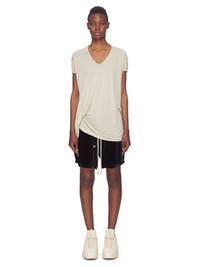 RICK OWENS FW22 STROBE HIKED T IN PEARL VISCOSE SILK JERSEY THIS HIKED T IS BELOW HIP LENGTH AND A LOOSE FIT. IT HAS A SOFT V NECK, SHORT SLEEVES, AND A SINGLE SEAM RUNNING DOWN THE CENTRE BACK SPINE. IT FEATURES A FOLD ON THE RIGHT HIP CREATING DRAPING AND AN ASYMMETRICAL HEMLINE THIS SEMI-TRANSPARENT LIGHTWEIGHT VISCOSE AND SILK BLEND JERSEY IS MADE FROM FSC® CERTIFIED VISCOSE WHICH ENSURES THAT THE FIBERS ARE PRODUCED FROM RESPONSIBLY MANAGED PLANTATIONS AND NO DEFORESTATION OCCURS - COLOR: PEARL - MATERIAL: 88% VISCOSE + 12% SILK - MODEL IS WEARING SIZE 40 - MODEL IS 181 CM TALL