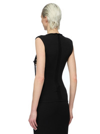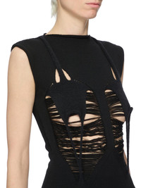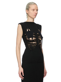 RICK OWENS FW25 CONCORDIANS RUNWAY TANJA TOP IN BLACK WOOL THIS TANJA TOP IS HIP LENGTH. IT HAS A ROLLED ROUND NECK WITH CAP SLEEVES. IT FEATURES CUT-OUTS ON FRONT CHEST, AND BUST, WITH A SLIGHTLY SHREDDED FRONT AND A FULL BACK WITH A CENTRE BACK CHANNEL DOWN THE SPINE. IT IS BODY REVEALING ON FRONT COLOR: BLACK NATURAL MATERIAL: 100% NEW WOOL DETAIL 48% ALPACA + 30% NYLON + 20% WOOL + 2% ELASTANE MODEL IS 181CM TALL MODEL WEARS SIZE S