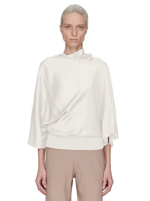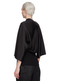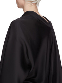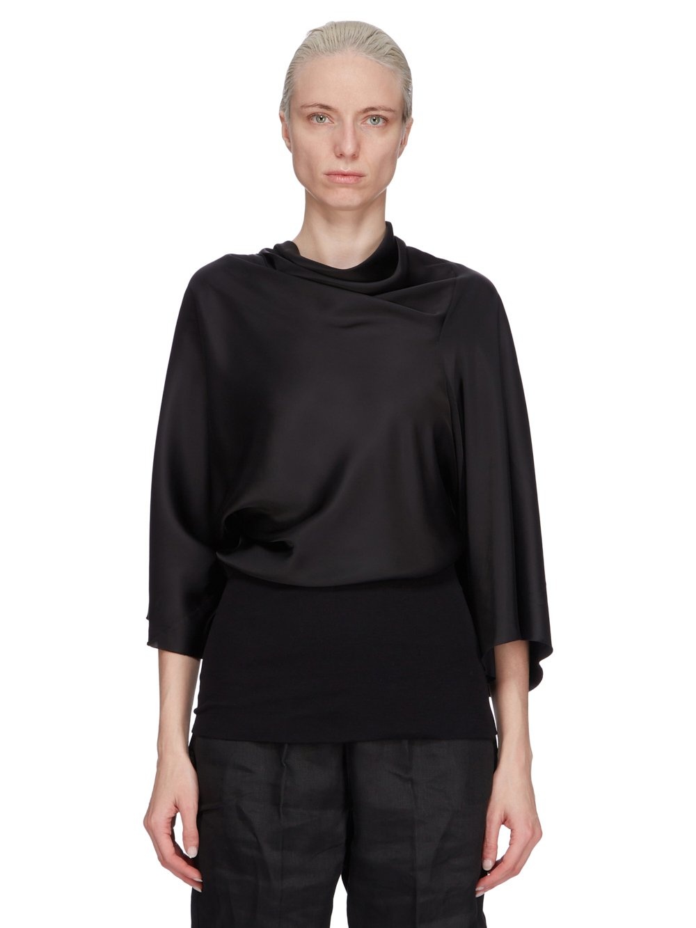 RICK OWENS SS25 HOLLYWOOD CYLINDER N BLACK WASHED CHARMEUSE THIS CYLINDER TOP IS HIP LENGTH. IT HAS A DRAPED, BIAS CUT BODY, ELBOW-LENGTH WIDE SLEEVES AND A HIGH DRAPED COWL NECK THAT HAS AN ASYMMETRICAL OPENING AT BACK. IT GATHERS INTO THE WAIST AND FINISHES IN A TIGHT BODY TO THE HIP THIS LIGHTWEIGHT AND FLUID CHARMEUSE HAS A SEMI-SHINY SURFACE AND WASHED FINISH.THIS FABRIC IS MADE FROM CERTIFIED VISCOSE WHICH ENSURES THAT THE FIBERS ARE PRODUCED FROM RESPONSIBLY MANAGED SOURCES AND NO DEFORESTATION OCCURS COLOR: BLACK MATERIAL: 61% ACETATE + 39% VISCOSE BOTTOM 100% COTTON MODEL IS 181CM TALL MODEL WEARS SIZE 40