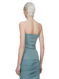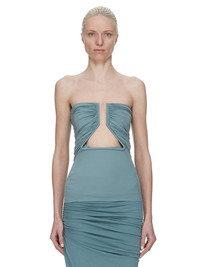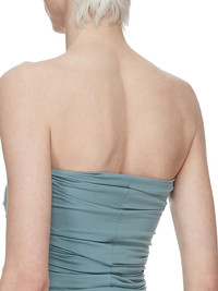 RICK OWENS SS25 HOLLYWOOD JERSEY PRONG BUSTIER IN MOUTHWASH NYLON STRETCH JERSEY THIS JERSEY PRONG BUSTIER IS HIP LENGTH WITH A CLOSE TO THE BODY FITS. IT FEATURES A RUCHED BODY GATHERING INTO THE BUST, WHICH FEATURES A BONED GEOMETRIC CUT OUT FRONT AND A TIGHT FITTING WAIST THIS LIGHTWEIGHT AND STRETCHY NYLON JERSEY HAS A MATTE SURFACE AND A SOFT HANDFEEL. THIS JERSEY IS MADE USING GRS CERTIFIED RECYCLED POLYAMIDE WHICH ENSURES A REDUCTION IN WATER CONSUMPTION, EMISSIONS AND HAZARDOUS WASTE, LESSENING THE DEPENDENCE ON NON-RENEWABLE RESOURCES COLOR: MOUTHWASH MATERIAL: 91% NYLON + 9% ELASTANEMODEL IS 181CM TALL MODEL WEARS SIZE 38